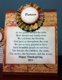 For this project I used 4"x 12" piece of dark brown card-stock scored at 1", 6" and 11".  I folded on the score lines and put a piece of sticky strip to hold the bottom of the tent.  I added a 4"x 4 1/2" piece of designer paper.  I printed out the poem (below) using my computer and layered it on a 3 3/4" x 2 3/4" piece of rust paper.  I used the Tim Holtz medium rosette with scrap paper.  I printed the names on the computer using MDS (My Digital Studio) Stampin up and punched them out with the 1 1/4" circle punch.  I layered onto a 1 3/8" punched rust circle.  I distressed the edges with brown ink.